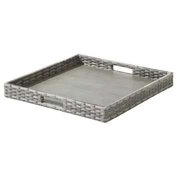 Dit stijlvolle vierkante dienblad is gemaakt van grijs halfrond geschuurd wicker met een kunststof plateau en onderdeel van de Levante serie. Het Dienblad Levante Grijs Wicker past perfect bij de hocker, horend bij de loungeset uit deze serie. In combinatie met deze hocker zal dit ideaal fungeren als een tafel, waar servies en accessoires op kunnen worden geplaatst. Om de levensduur van het buitenplateau verlengen, wordt aangeraden deze op een droge plek op te bergen. Het dienblad is 70 centimeter breed, 70 centimeter lang en 8 centimeter hoog.