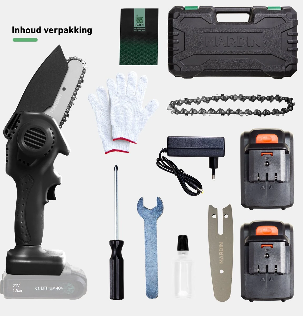â–¶ Volledig draadloos – De Mardin® Mini kettingzaag – MK-1 is eenvoudig op het meegeleverde laadstation op te laden. Binnen slechts 1,5 uur is de elektrische kettingzaag volledig opgeladen. Met de GRATIS meegeleverde extra accu zul je nooit met een lege batterij staan!