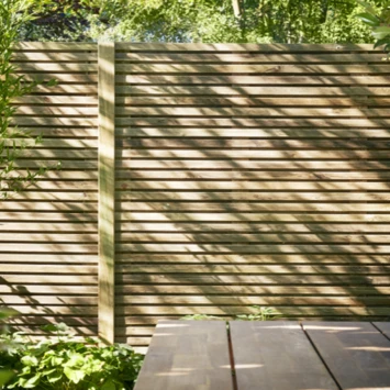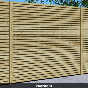 De lamellenschutting is een houten schutting bestaande uit latten in plaats van planken. Dit tuinscherm is een modernere uitvoering dan de standaard tuinschermen. Het tuinscherm is gemaakt van grenenhout, een zeer geschikte houtsoort voor het gebruik in de tuin. Door het impregneren van het hout is deze schutting beter beschermd tegen weersomstandigheden. Door de overlappende latjes is de doorkijk bij de schutting minimaal.